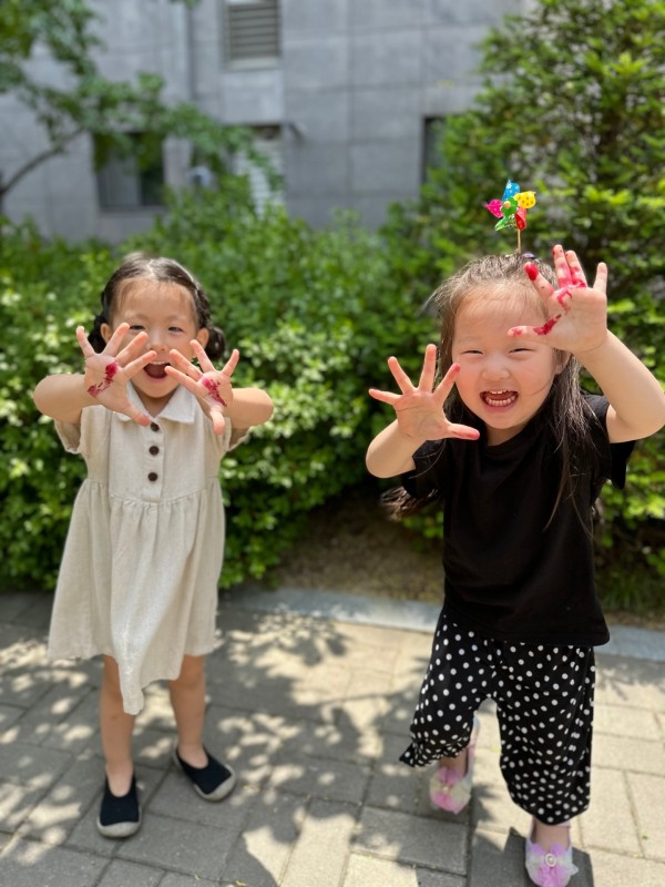 '버찌 봤지!' - 어린이집 앞 산책을 하며 화단에 떨어진 버찌 열매를 관찰해보고, 확장놀이로 버찌열매로 그림그리기 놀이를 하였던 모습을 담은 작품