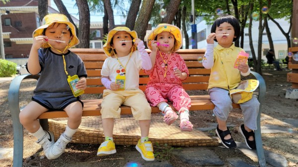 '비눗방울이 퐁퐁퐁' - 손을 씻을 때 비누거품으로 놀이를 하던 영아들이 거품이 커질 때마다 손바닥으로 터뜨리며 즐거워하여 실외활동으로 비눗방울 놀이를 계획하였습니다. 입으로 바람을 불 때마다 하나, 둘 비눗방울이 날아가는 모습을 관찰하며 즐겁게 놀이하는 모습입니다.