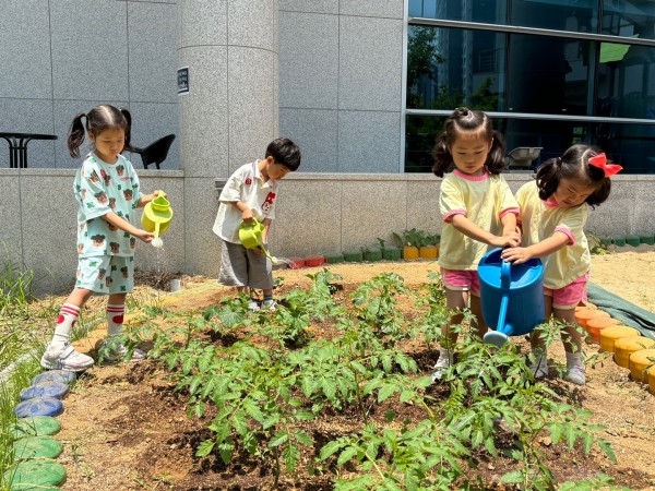'꼬마 농부들의 여름 나기' - 어린이집 텃밭에서 아이들이 직접 토마토와 고추 모종을 심고 물을 주고 있는 모습입니다. 아이들이 먼저 '물 주러가요!' 라고 이야기하며 물조리개를 챙기고, 스스로 물을 떠 모종에게 물을 주어 자립심을 기르고, 생명의 소중함을 느낄 수 있습니다.
