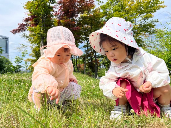 '어? 이게 뭐지?' - 잔디밭을 살펴보다 꼬물꼬물~ 벌레가 나타나 "우와~! 신기해!" 발견한 벌레를 친구에게도 알려주는 모습을 담은 작품