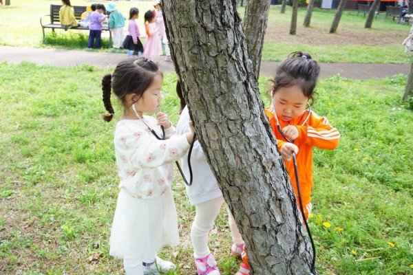 '나무의 속삭임' - 위 사진은 청진기를 사용해 나무 안에 흐르는 물소리를 들으며 움직이지는 않지만, 나무도 살아있는 소중한 생명임을 느껴 본 순간을 담은 작품이다.