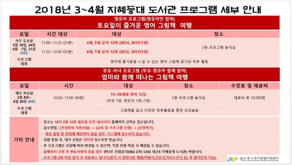* 진행 일정(날짜) 및 세부내용은 가정양육지원사업 -> 교육 및 프로그램 신청 메뉴에서 보실 수 있습니다.