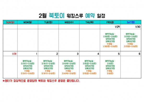2월 6일(토) | 오전(10시~12시) | 오후(14시~16시) | 오전(10시~12시) | 오후(14시~16시) |