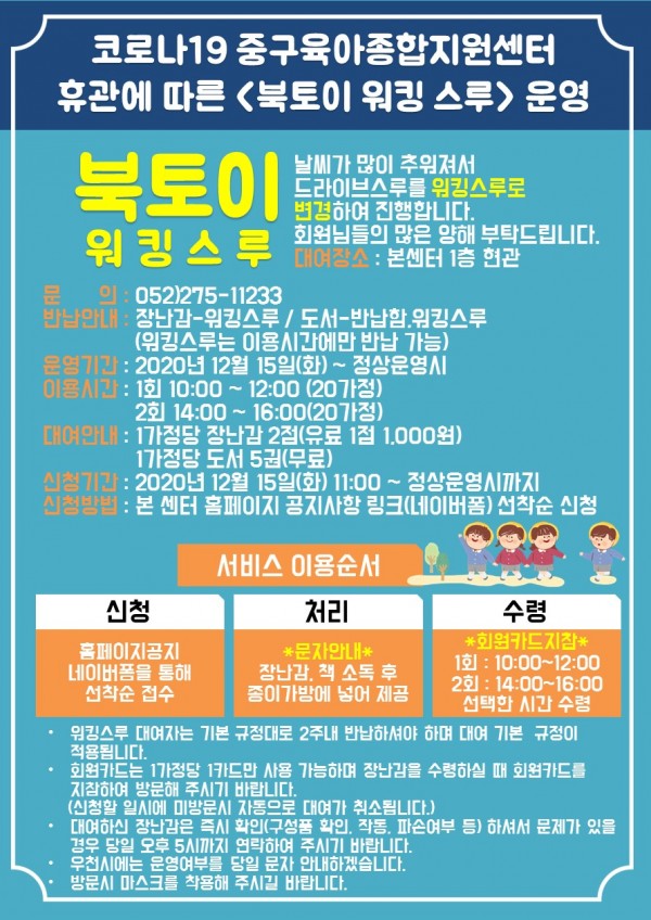 ex) 12월 3일(수) 예약 : 12월 1일(화) 홈페이지에서 12월 3일(수) (네이버폼) 접수 → 12월 2일(화)문자안내 → 12월 3일(수) 장난감, 도서 수령가능