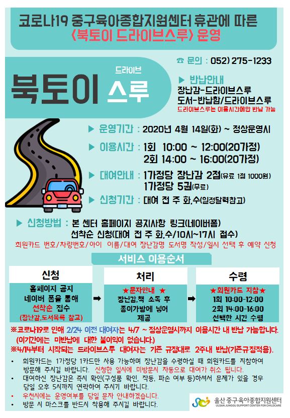 장난감, 도서 대여를 4/14(화)부터 드라이브스루로 이용하실 수 있습니다.