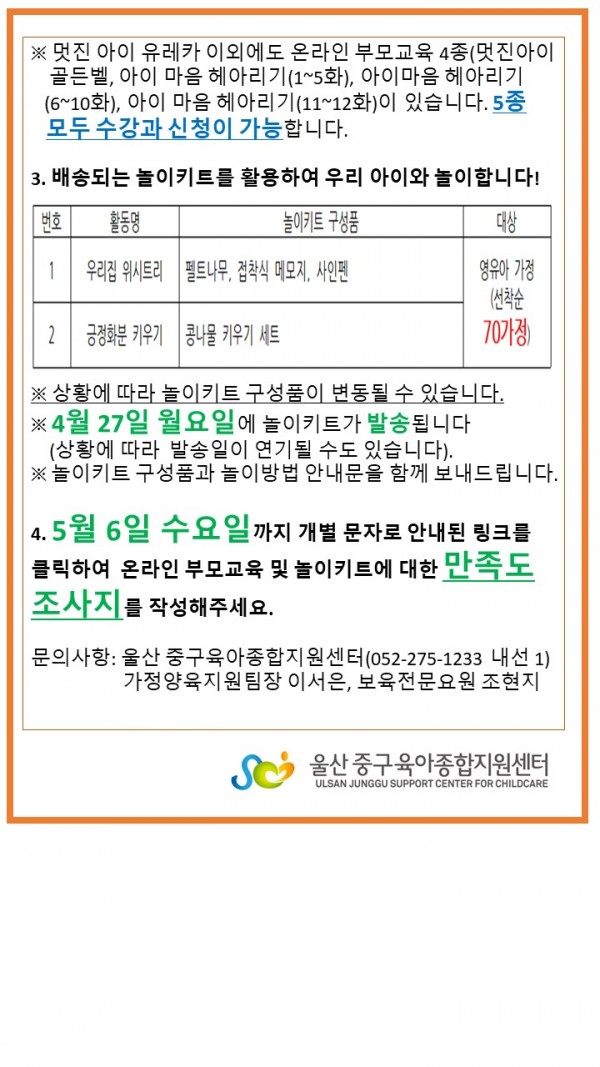 -코로나 19로 인해 공통부모교육을 대면 형태로 진행하는 것이 어려워 온라인 부모교육(비대면)을 진행하고자 합니다. 온라인 부모교육을 수강하신 분(선착순 70명)들에 한 해 아이와 집에서 놀이할 수 있는 놀이키트와 놀이 방법 안내문을 보내드립니다. 부모님들의 많은 관심과 참여 부탁드립니다