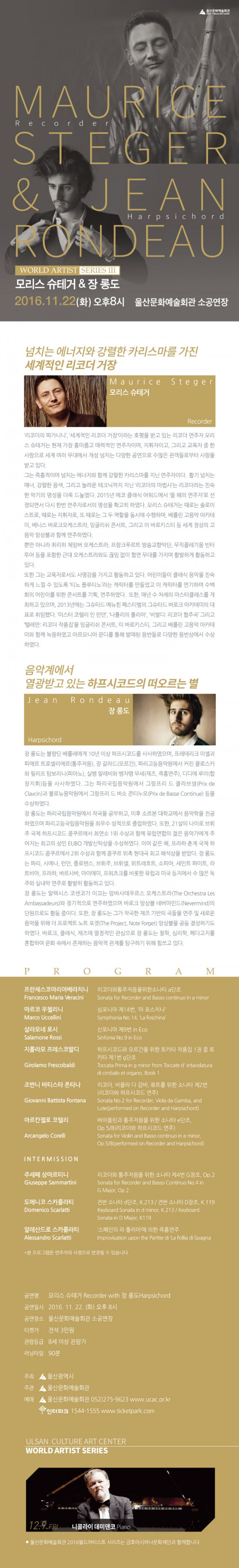 | 공연 제목 | [월드아티스트 시리즈]모리스 슈테거 Recorder & 장 롱도 (Harpsichord) - 울산 |