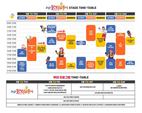 2023울산공업축제가 개최되는 나흘 동안 태화강남구둔치와 태화강국가정원 야외공연장, 그리고 왕버들마당에서는 남녀노소 모두가 즐길 수 있는 다채로운 프로그램이 준비되어 울산의 화합을 도모할 예정이다.