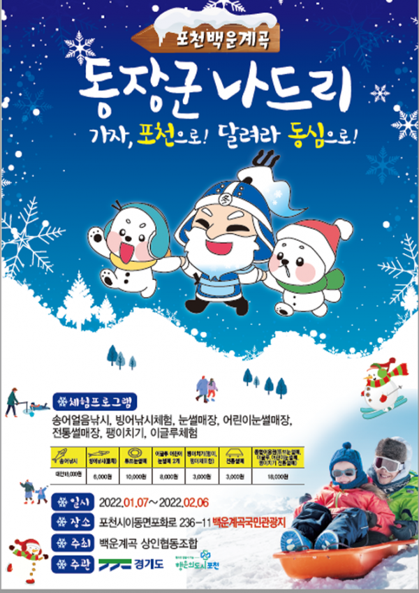 코로나19로 대부분의 지역축제가 취소되고 있다. 하지만 산과 계곡과 어우러져 경치가 아름다운 포천백운계곡네에서 현지마을 주민들이 손수 만들어 가는 제1회 백운계곡동장군나드리 란명으로 가자 포천으로! 달려라 동심으로!란 주제로 2022년 1월 7일~2월6일까지 30일간열려진다. 약3천평부지네 에서 이루어지는 축제는 겨울 여행의 테마가 있는 놀이와 먹거리 체험등 다양한 프로그램으로 진행되며. 특히 처음 선보이는 눈썰매장은 길이가 약 120m로 계곡과 주변 경관과 어우러져 눈썰매를 타며 전후 좌우 아름다운 경치를 감상 할 수 있어 그야말로 수도권 내에서 최고임을 자랑한다.