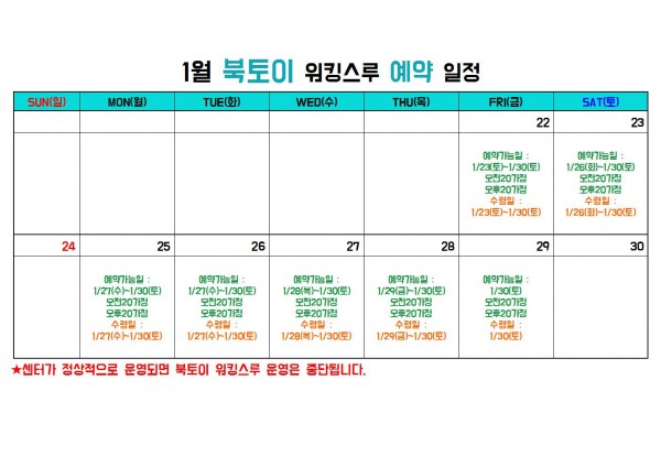 1월 30일(토) | 오전(10시~12시) | 오후(14시~16시) | 오전(10시~12시) | 오후(14시~16시) |