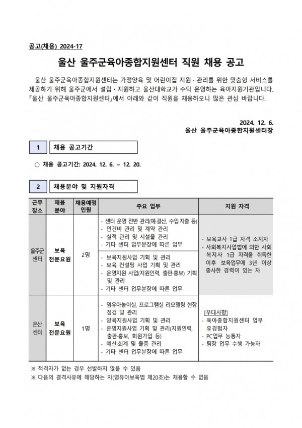 [채용공고]울산 울주군육아종합지원센터 직원 채용 공고