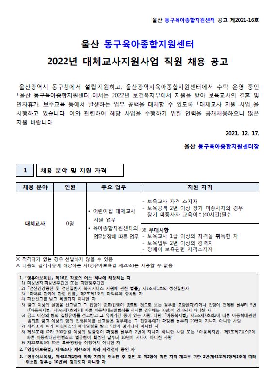 [채용공고] 울산 동구육아종합지원센터 대체교사 채용 안내