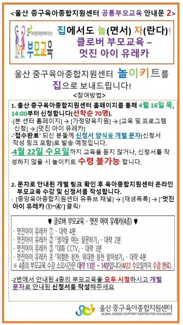 -코로나 19로 인해 공통부모교육을 대면 형태로 진행하는 것이 어려워 온라인 부모교육(비대면)을 진행하고자 합니다. 온라인 부모교육을 수강하신 분(선착순 70명)들에 한 해 아이와 집에서 놀이할 수 있는 놀이키트와 놀이 방법 안내문을 보내드립니다. 부모님들의 많은 관심과 참여 부탁드립니다