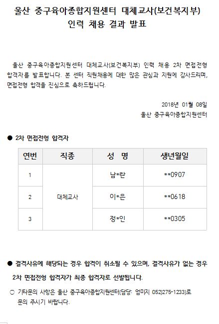 [채용] 울산 중구육아종합지원센터 2018년 보건복지부 대체교사 채용 최종합격자 안내