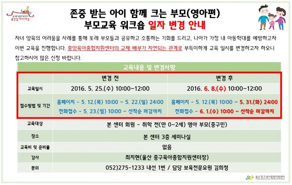 [가정양육] 존중 받는 아이 함께 크는 부모(영아편) 부모교육 워크숍 일자 변경 안내