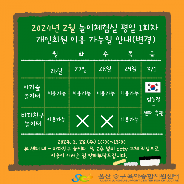 [가정양육] 놀이체험실 - 2024. 2. 26.(월) ~ 2. 29.(목) 평일1회(10:30~11:50)개인회원 이용 가능…