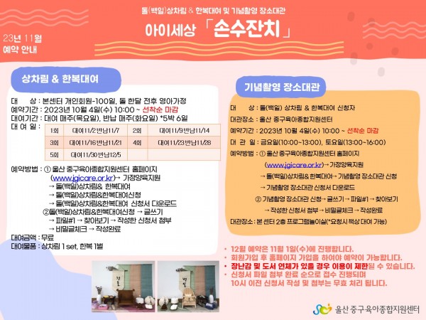 장난감 세상에서 돌(백일) 상차림 & 한복대여 및 장소대관 예약이 진행됩니다.