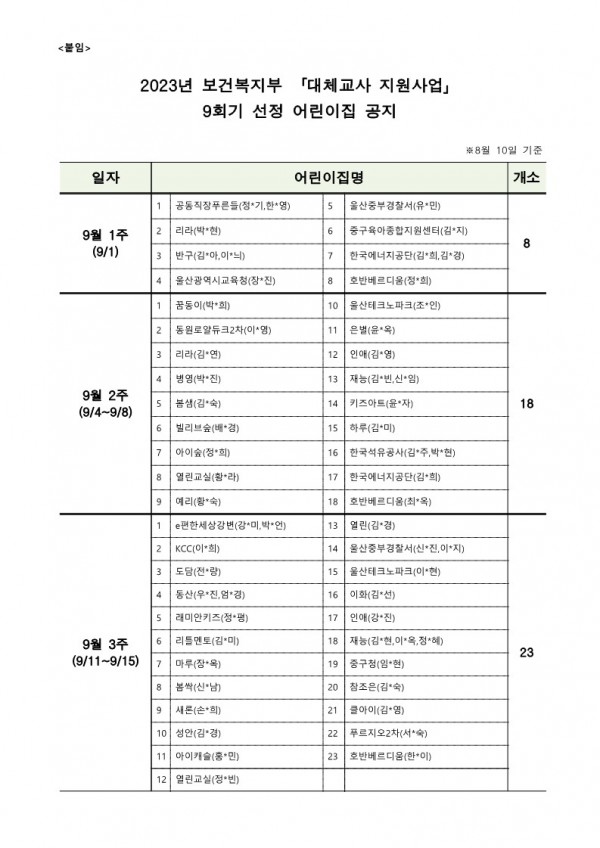 2023년 보건복지부 「대체교사 지원사업」 9회기 선정 어린이집 공지-붙임.pdf