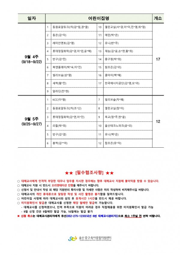 [어린이집] 울산 중구육아종합지원센터 2023년 보건복지부 「대체교사 지원사업」 9회기 선정 어린이집 공지