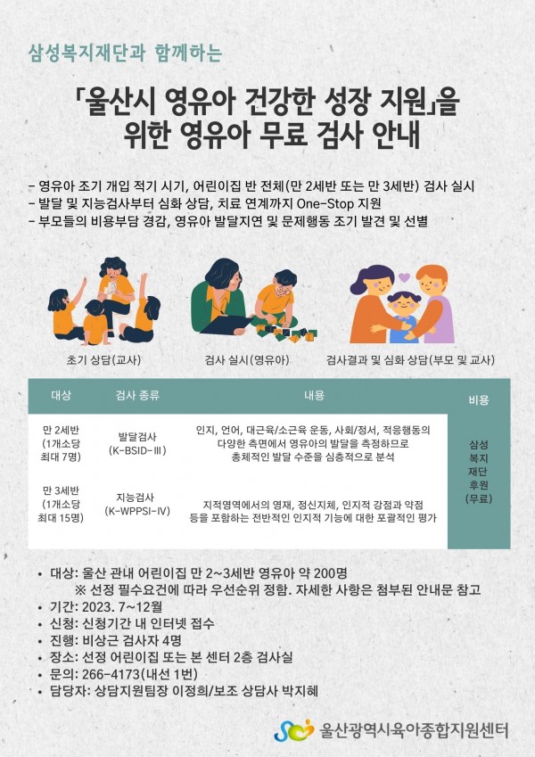 울산시 영유아 건강한 성장지원을 위한 영유아 무료검사를 진행하오니 많은 참여 바랍니다.