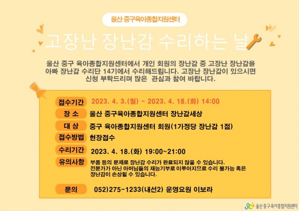 기한에 맞춰서 수리할 장난감 들고 오시면 되겠습니다.