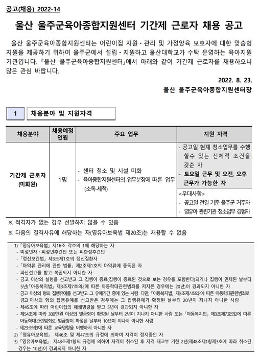 [채용공고] 울산 울주군육아종합지원센터 기간제 근로자 채용 안내