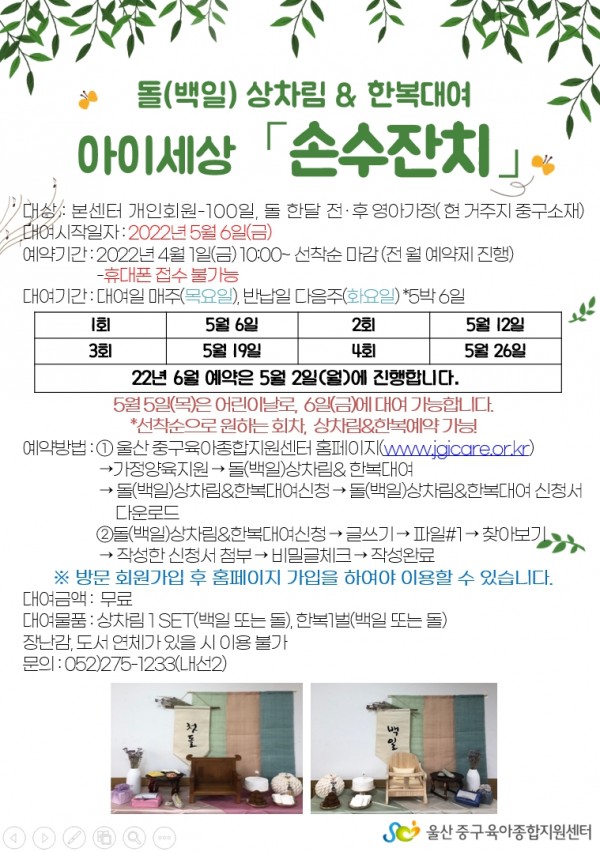 [가정양육] 아이세상「손수잔치」 - 22년 5월 대여 예약 및 돌·백일상 구성품 추가 안내 돌(백일) 상차림 & 한복 대여 …