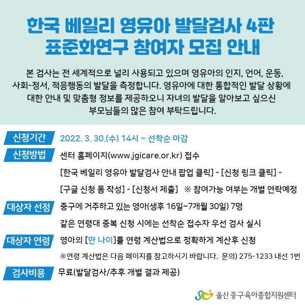 이 검사는 전 세계적으로 널리 사용되고 있으며 영유아의 인지, 언어, 운동, 사회-정서, 적응행동의 발달을 측정합니다. 영유아에 대한 통합적인 발달 상황에 대한 안내 및 맞춤형 정보를 제공하오니 자녀의 발달을 알아보고 싶으신 부모님의 많은 참여 바랍니다.