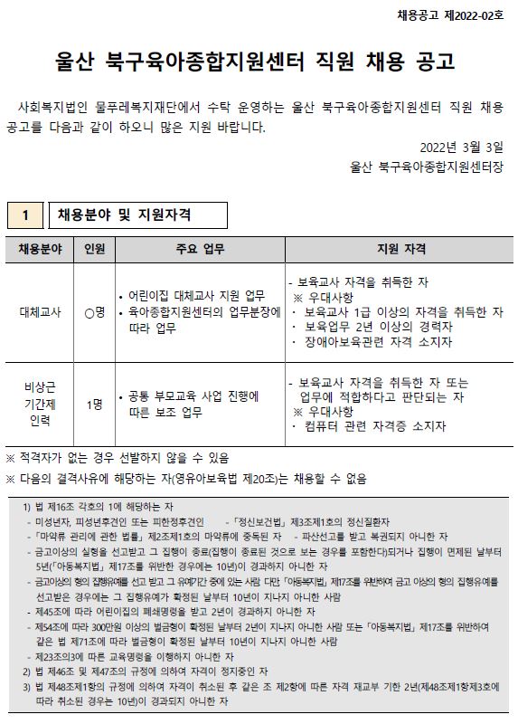 [채용공고] 울산 북구육아종합지원센터 대체교사 채용 안내