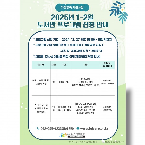 ♡ 2025년 1-2월 <도서관 프로그램>은 본 센터 2층 프로그램 놀이실에서 진행합니다.