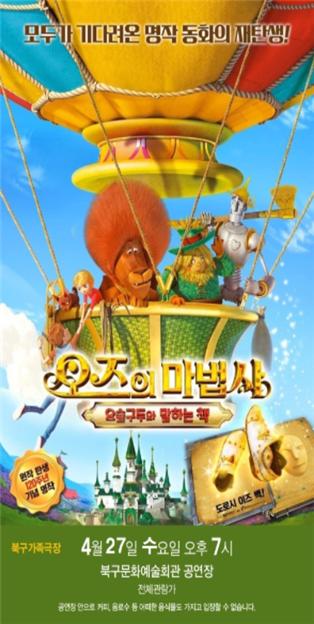 북구문화예술회관 무료 영화상영 안내-일시/장소: 2022. 4. 27.(수) 19:00 (늦은7시) / 북구문화예술회관 2층 공연장 -영화제목 : 오즈의마법사 : 요술구두와 말하는 책