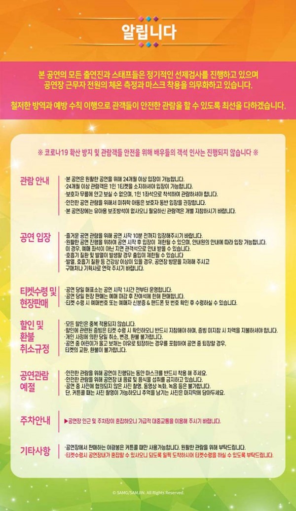 공지사항* 판매마감 : 2022년 10월 14일(금) 17시 (예매마감시간은 기획사의 사정에 따라 변동될 수 있습니다.) 제한이 있을 수 있으니 진행요원의 안내에 따라 주시기 바랍니다. |