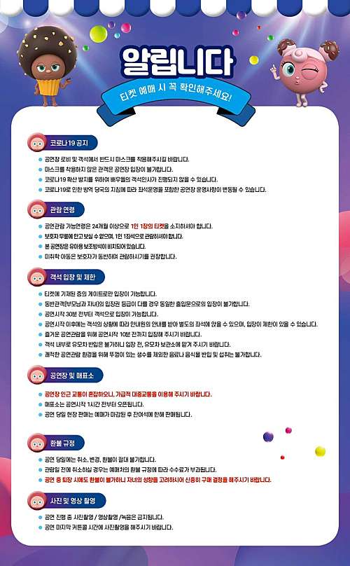 - 24개월 이상 유료관람(1인 1티켓 소지) (24개월 미만 입장불가!!)- 공연이 시작된 후에는 원활한 공연 운영과 다른 관객들의 관람에 방해가 되지 않도록 입장에 제한이 있을 수 있으니 진행요원의 안내에 따라 주시기 바랍니다.