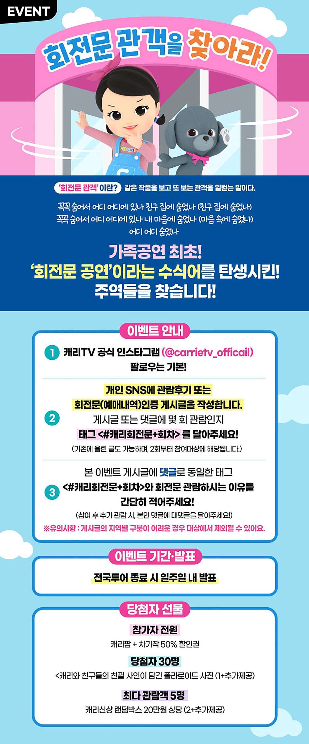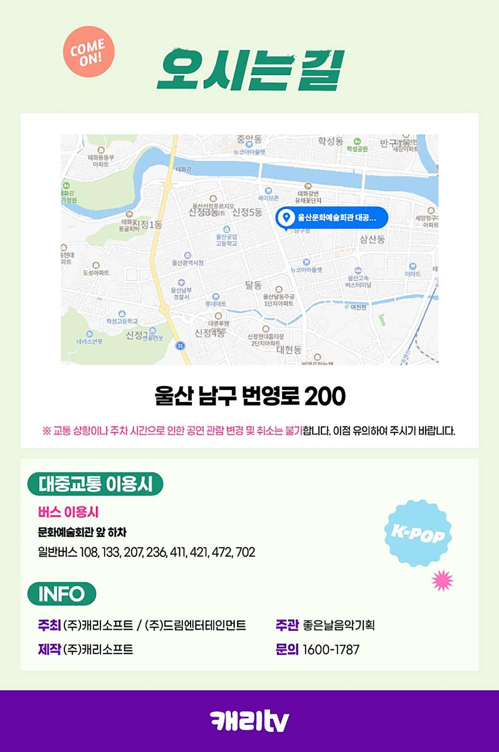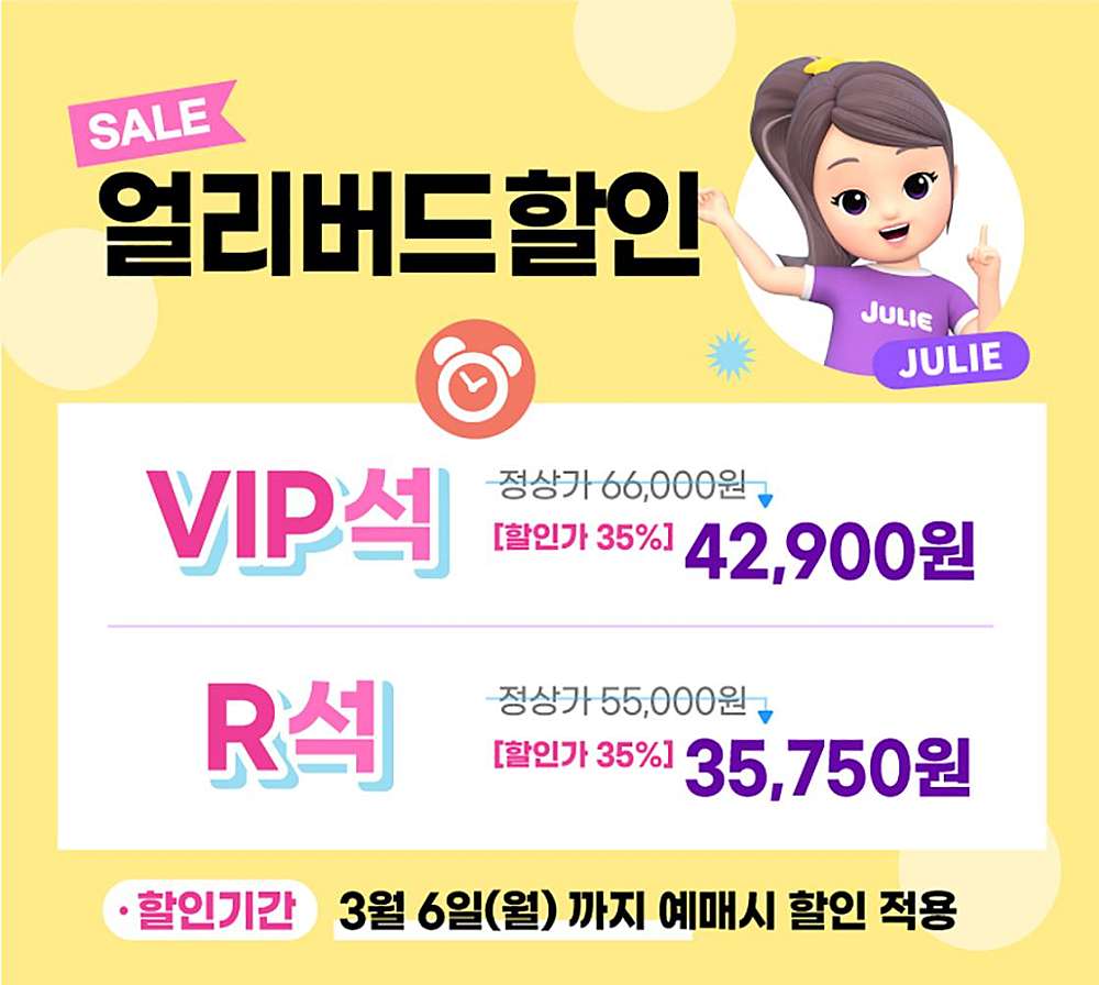| 기타사항 | 구 분 : 공연 장 르 : 콘서트 공연기간 : 2023-03-11~2023-03-12 공연시간 : 토 11:00, 14:00, 16:30 일 11:00, 14:00, 16:30 러닝타임 : 70분 공연장소 : 울산문화예술회관 대공연장 티켓정보 : VIP석 66,000원, R석 55,000원 관람등급 : 전연령관람가 주 최 : (주)캐리소프트/(주)드림엔터테인먼트 주 관 : 좋은날음악기획 공연문의 : 1600-1787