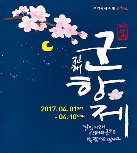 군항도시에서 함께 즐기는 세계최대 벚꽃축제 <진해군항제>가 2017년 4월 1일부터 10일까지 개최 된다. 중원로터리에서 전야제, 팔도풍물시장, 예술문화공연 등 주요 행사가 열리고 북원로터리에서는 이충무공 동상에 헌다헌화, 추모대제, 승전행차 퍼레이드가 열린다. 또한 군항도시의 특성을 살린 '군악의장페스티벌'은 축제기간 중 개최 되는데 군악·의장이 융합된 군대예술 공연으로 군악 대의 힘찬 마칭공연과 의장대의 멋있는 제복에 절도 있는 공연은 진해군항제에서만 볼 수 있는 공연이다.