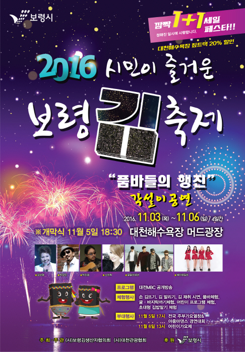 올해 2회 째를 맞고 있는 보령 김축제는 4계절 방문하고 싶은 도시 보령에서 새로운 축제로 진행 하고 있는 보령 대표적인 겨울 축제 이다. 행사 장소는 대천해수욕장 머드광장 이고 2016년 11월 3일 ~ 11월 6일 까지 4일간 진행 된다. 다양한 체험 행사와 부대행사가 준비되어 있다.