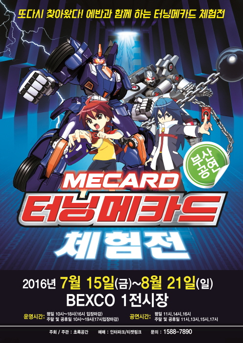 터닝메카드 체험전은 2016년07월15일 부터2016년08월21일 까지 부산벡스코에서 개최한다. 본 행사는 20여종의 실제 사이즈의 초대형 메카니멀과 30여종 캐릭터 코스프레 및 가종 전시물이 함께하는 특별한 체험전으로 TV속 만화 주인공들을 전시장 내에서 직접 보고 만지고 체험할 수 있는 국내 최대 규모 메카니멀 체험전이다.