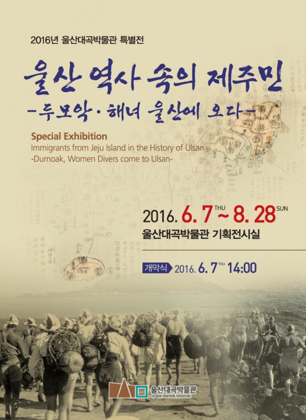 - 울산광역시립 대곡박물관은 울산 역사문화 연속 기획 특별전으로, 울산과 제주도와의 관련성과 울산 역사문화의 다양성을 살펴보는 <울산蔚山 역사 속의 제주민濟州民 -‘두모악’·해녀海女 울산에 오다->를 개최합니다. 이번 특별전은 울산과 제주도와의 관계를 다룬 최초의 전시로, 4부로 구성하였습니다. I. 조선시대 울산에 살았던 제주민(두모악) / II. 조선시대 제주도 사람들 / III. 바다와 제주 해녀 / IV. 울산에 온 제주 해녀, 재울 제주도민회 / 조선시대 울산에 살았던 제주도 사람들에 대해서는 『학성지』와 『울산부 호적대장』 등에 기록되어 있습니다. 근대에 와서 제주 해녀들이 울산으로 많이 왔으며, 이들 가운데 일부는 울산에 정착하기도 했습니다. 현재 울산광역시에는 제주도 출신이 3만명이 살고 있습니다. 이번 전시를 통해 울산 역사 이해의 폭을 넓히고, 울산광역시를 구성하고 있는 사람들에 대해 관심을 가져보는 기회가 되길 기대합니다. 바다와 접한 울산이지만 그동안 바다와 관련된 역사에 대해서는 좀 소홀한 감이 있었는데, 이번 특별전은 울산의 바다와 관련된 역사에 관심을 갖는 출발로서의 의미도 있다고 생각합니다. 전시는 2016년 6월 7일부터 8월 28일까지 개최합니다. 아무쪼록 많이 오셔서 관람해 주시기 바랍니다. 전시 개최에 도움을 주신 모든 분들께 감사드립니다.