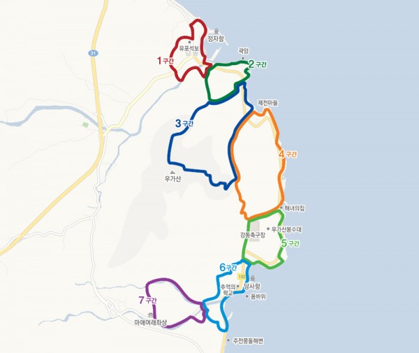 인기대중 가요 울산아리랑의 노랫말에서 자랑하는 정자바닷가를 중심으로 문화유적과 작은 포구를 잇는 둘레길을 연결하여 문화와 역사가 어울리는 총 30.9km의 녹색명품길