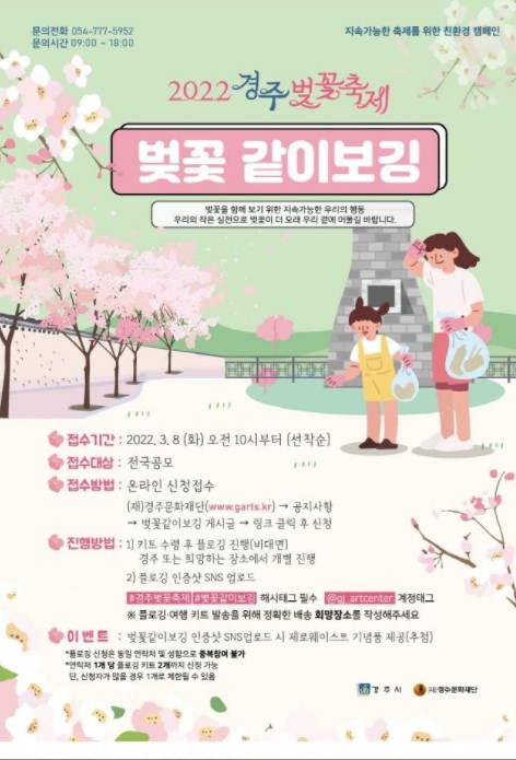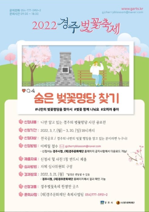 비대면이지만, 벚꽃과 어울리는 다양한 콘텐츠로 경주벚꽃축제를 즐기는 관광객들에게 즐거움을 선사합니다.※ 2022 경주벚꽃축제 일정은 벚꽃개화 시기에 따라 유동적입니다.
