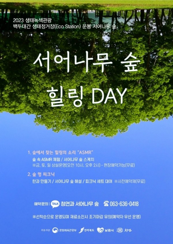 프로그램 1. 숲에서 찾는 힐링의 소리 ASMR은 도시 소음에 지친 현대인의 고막을 서어나무 숲만의 잔잔한 바람과 낙엽 소리등으로 힐링해주는 시간이다. 이러한 ASMR 체험과 함께 서어나무를 보고 그릴 수 있는 스케치 도구를 제공해주어 숲의 소리 뿐만 아니라 직접 느낀 숲의 모습을 그려 갈 수 있는 시간을 제공한다. 매주 금,토,일 오전10시 오후2시에 9월중까지 상설운영 예정이다.